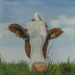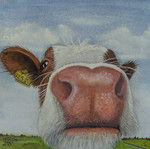 een serie van vier kleine schilderijtjes, met daarop een koe afgebeeld in wisselend perspectief